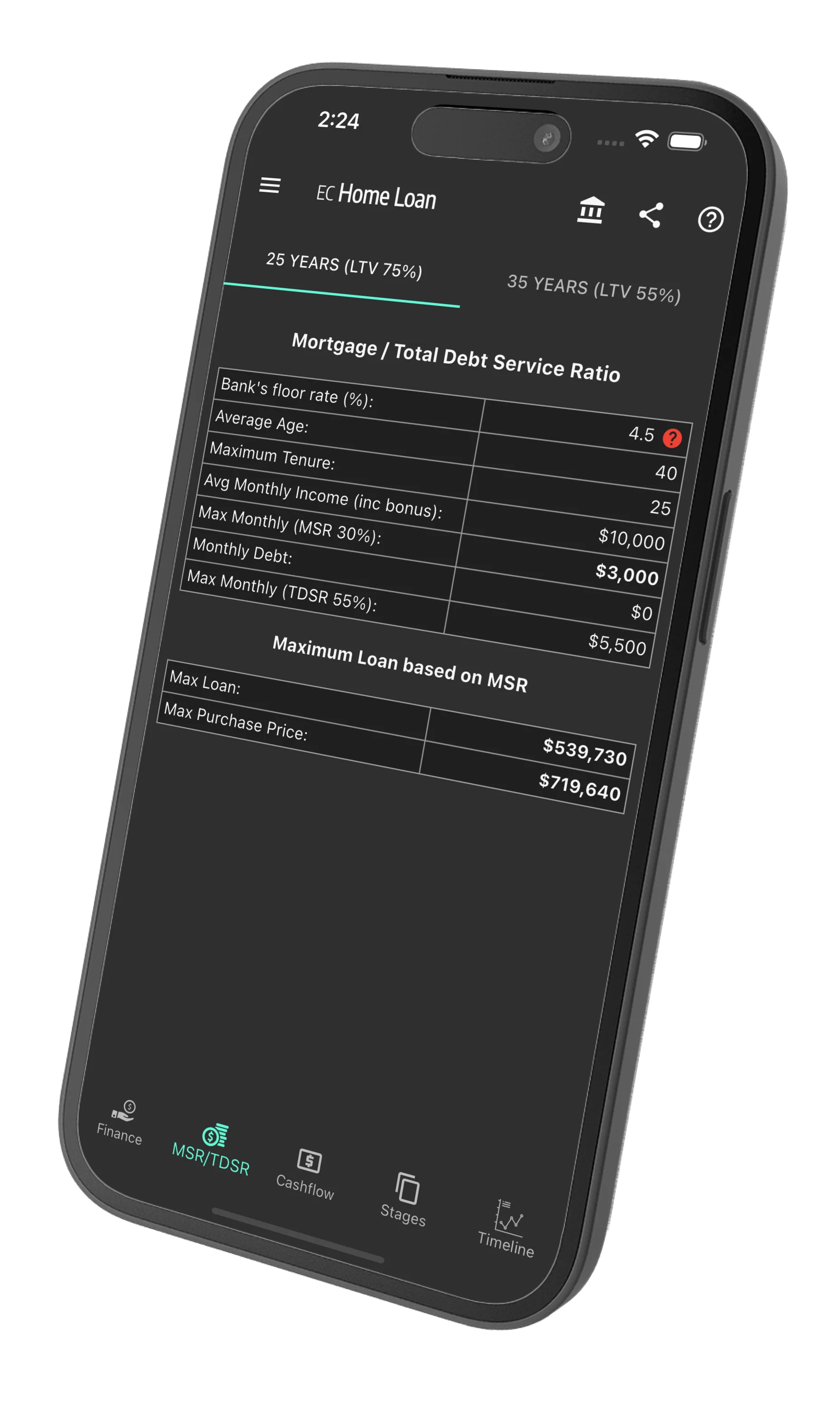Home Loan Cashflow Analysis: Calculates Total Debt Servicing Ratio (TDSR) and Mortgage Servicing Ratio (MSR) based on user income and relevant data, providing maximum loan amounts and purchase prices. It also details cash requirements based on tenure or Loan-to-Value (LTV) options, and outlines payment amounts (Cash/CPF) during initial stages and disbursements at various stages.